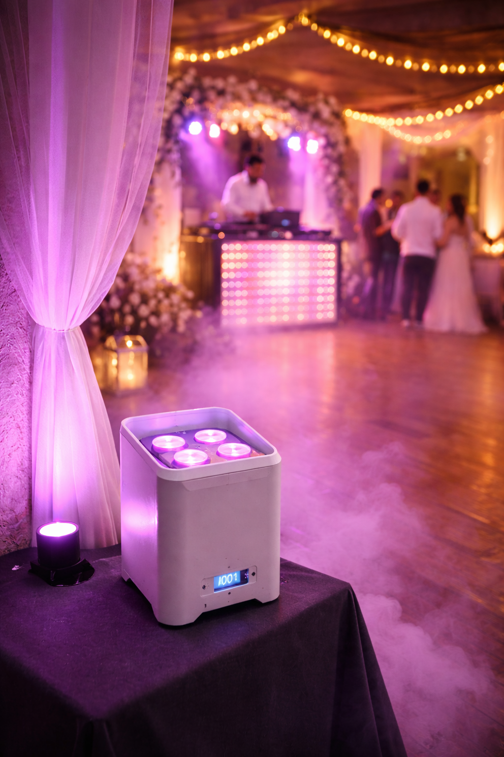 Ambientebeleuchtung (Floorspots): Farbige Highlights, die eine Location mit farbenfrohem Licht ausleuchten und eine besondere Atmosphäre schaffen. Sie bieten eine alternative Möglichkeit, den gesamten Raum mit stimmungsvoller Farbe zu füllen, anstatt nur die Tanzfläche zu beleuchten.